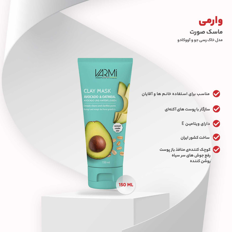 ماسک جو و آووکادو وارمی پوست شما را از هرگونه جوش سرسیاه و آلودگی پاکسازی کرده و احساس تمیزی و شادابی را به شما هدیه میدهد. این ماسک داخل ترکیبات خود کائولین و بنتونیت دارد در نتیجه تمامی آلودگیها، ناخالصیها و گرد و غبار را به خوبی جذب کرده و پوستی شاداب و تمیز را برای شما به ارمغان میآورد. این ماسک به صورت تخصصی بر روی جوشهای سرسیاه تاثیر گذاشته و به خوبی منافذ باز را تمیز میکند. رفع جوشهای زیر پوستی و همچنین جوشهای سطحی نیز از دیگر کاربردهای منحصر به فرد و استثنایی این ماسک هستند. ماسک خاک رسی جو و آووکادو وارمی یک انتخاب عالی برای افرادی است که پوست نرمال تا مختلط دارند.